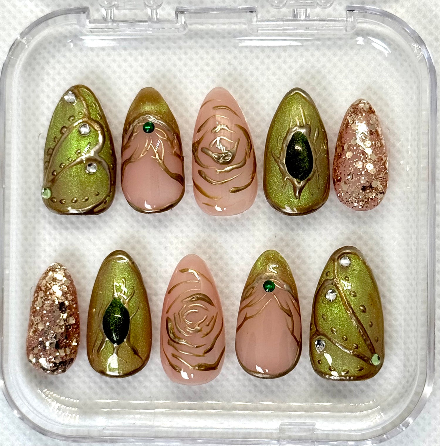 Emerald Bloom Press-On Nail Set – 3D Floral & Deep Green Elegance