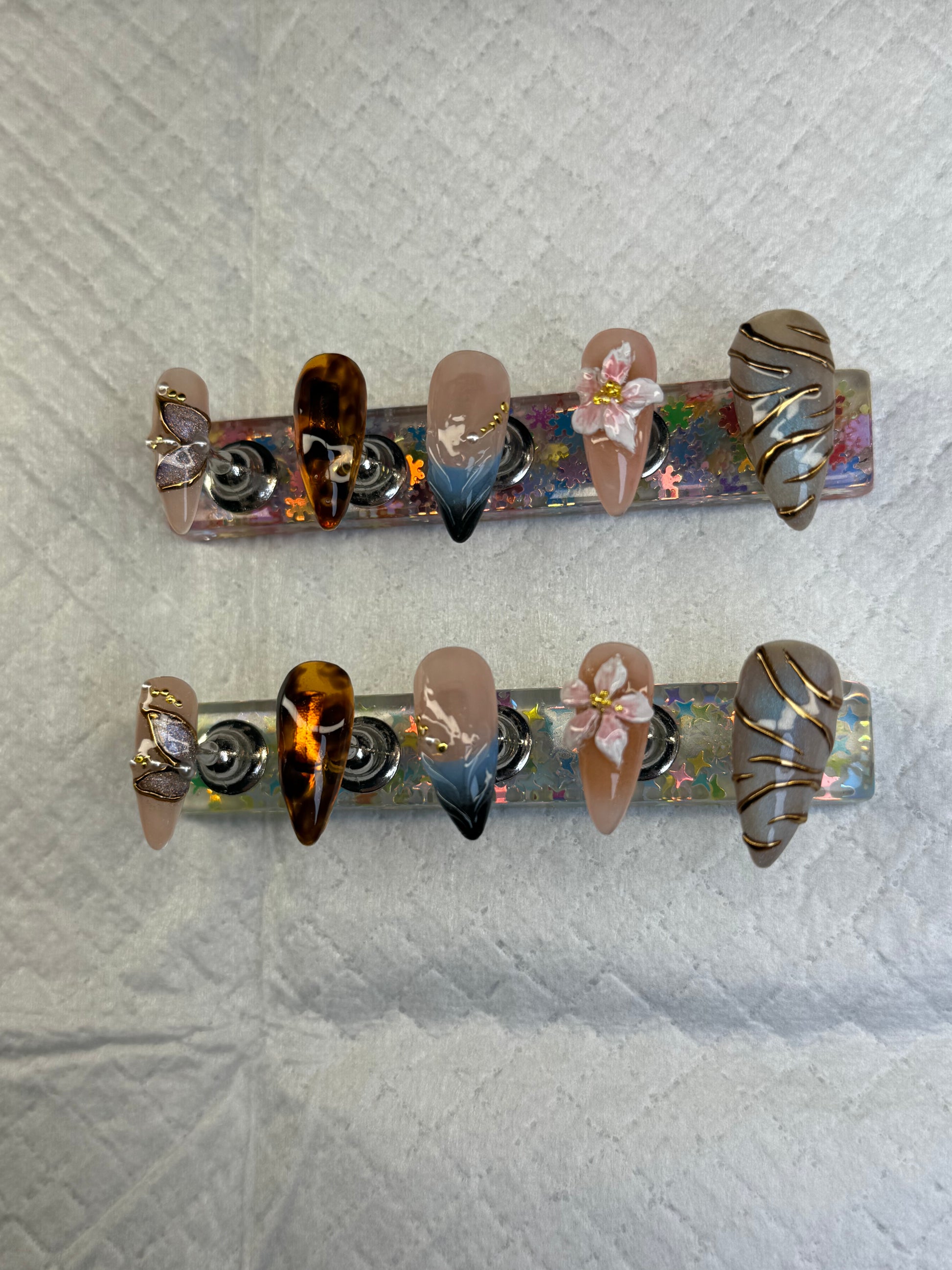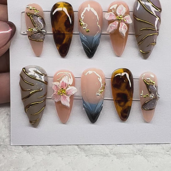 This Autumn Muse press-on nail set blends elegance and artistry for a look that’s both chic and versatile. Featuring rich tortoiseshell patterns, hand-painted florals, smoky gradient details, and golden wire accents, this set is designed to make your nails look like true statement pieces. Perfect for fall and beyond, each nail is crafted with intricate detail and a luxe finish.