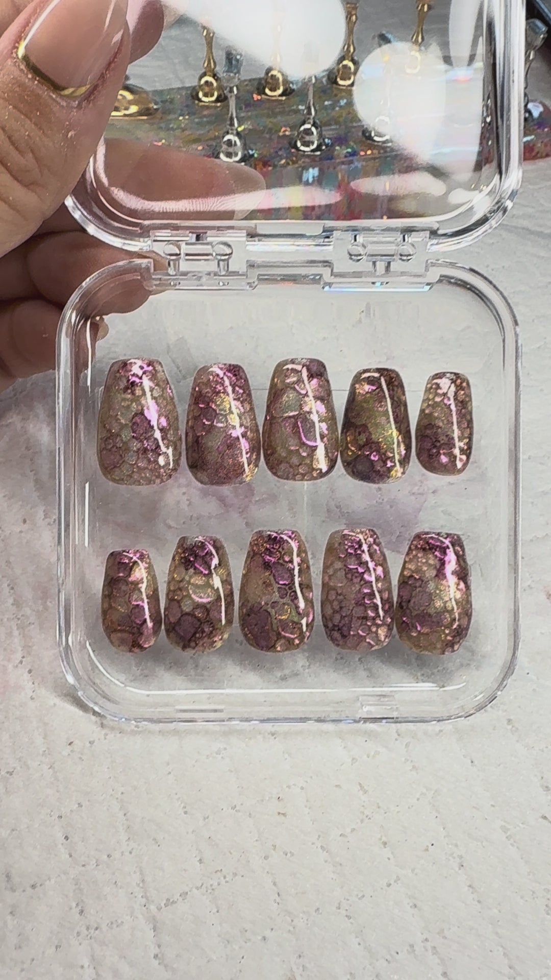Unleash your inner dragon with the "Dragon’s Kiss" press-on nail set. Featuring shimmering pink, purple, and gold dragon scale patterns, these nails bring a playful and mystical vibe to your look. Easy to apply and perfect for adding a fiery touch to any outfit, they’re ideal for those who love a bold, magical statement without the hassle. Get ready to turn heads and feel fierce wherever you go!