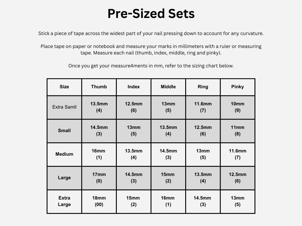 To ensure your set fits perfectly, please measure your natural nails using a soft measuring tape.