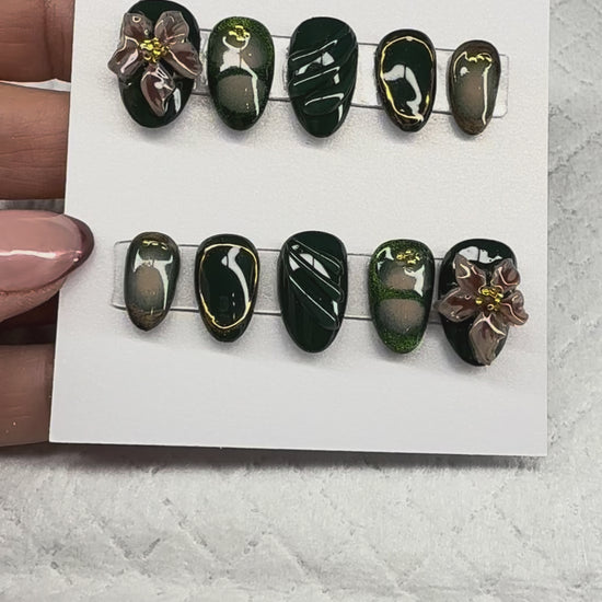 Bring luxury to your fingertips with this handcrafted press-on nail set featuring deep emerald green tones, shimmering gradients, and a stunning 3D flower accent. Perfect for special occasions or everyday glam, this set combines bold color with elegant floral artistry for a show-stopping look.