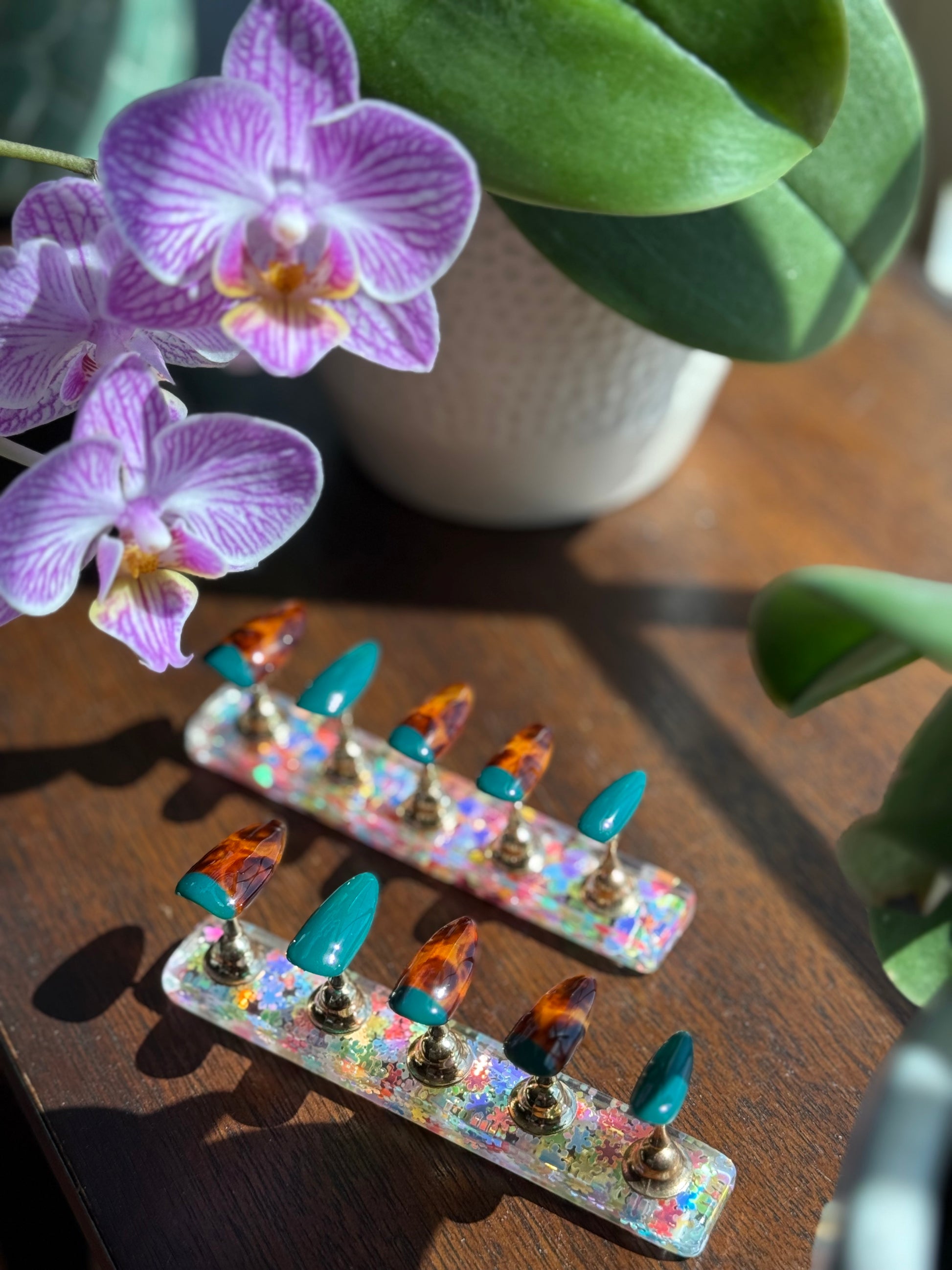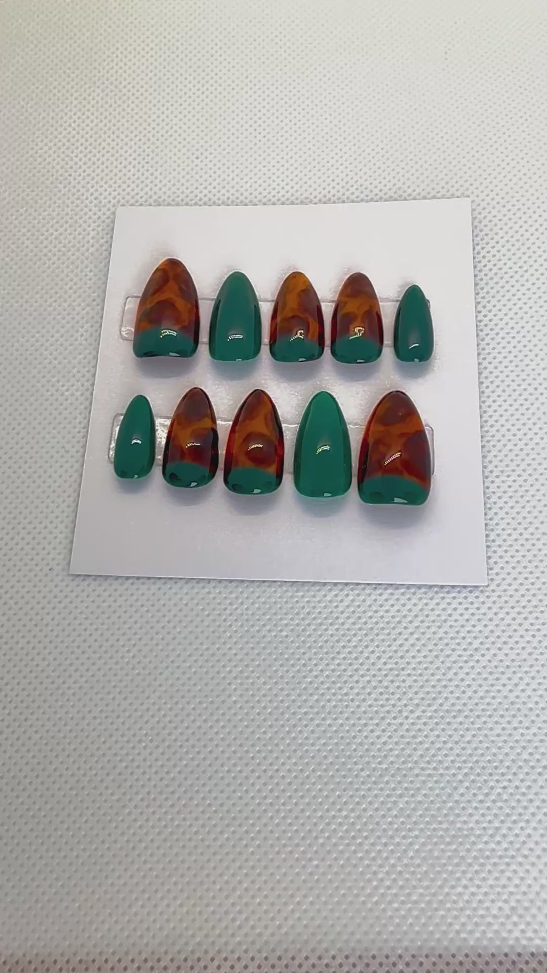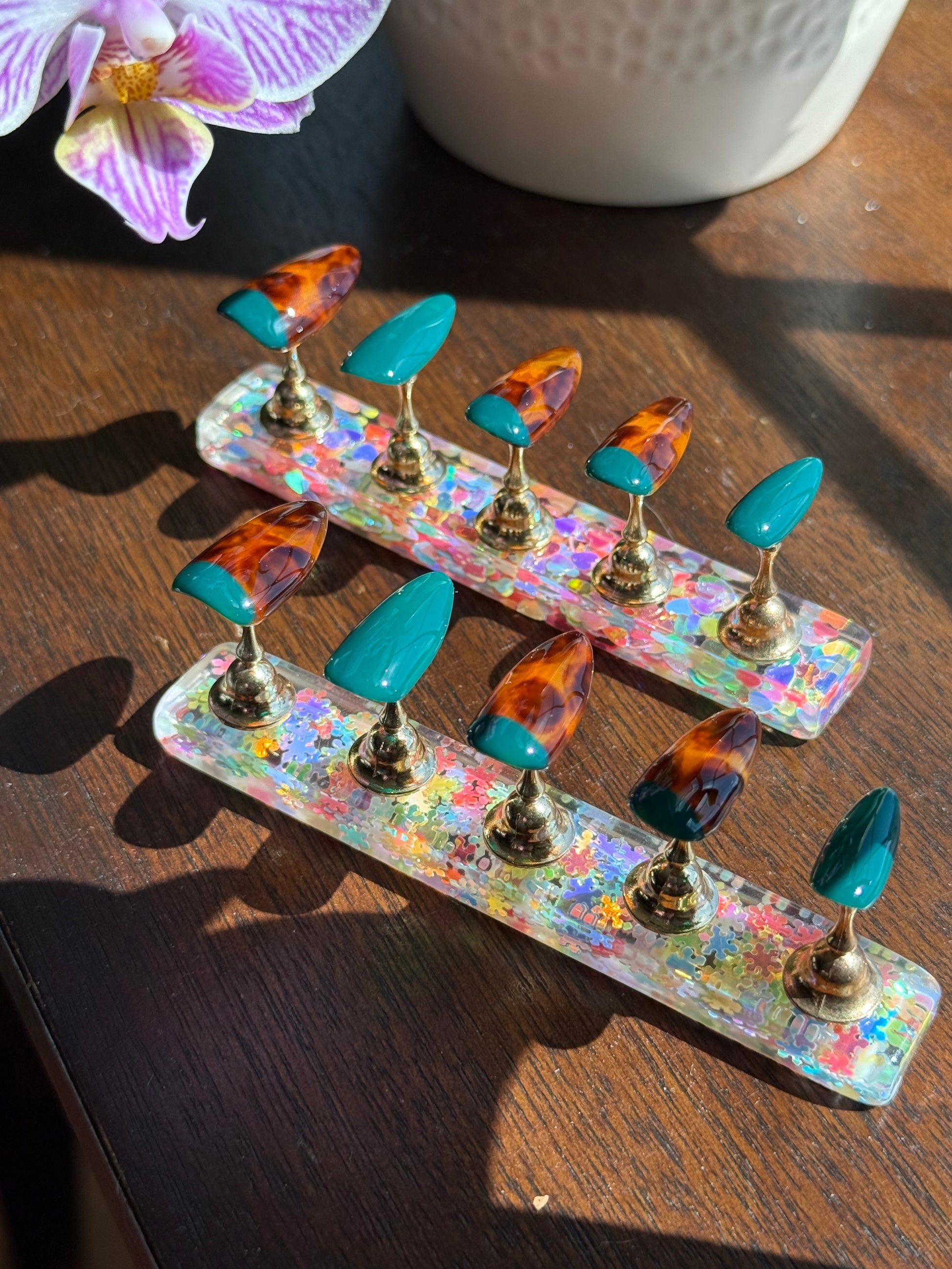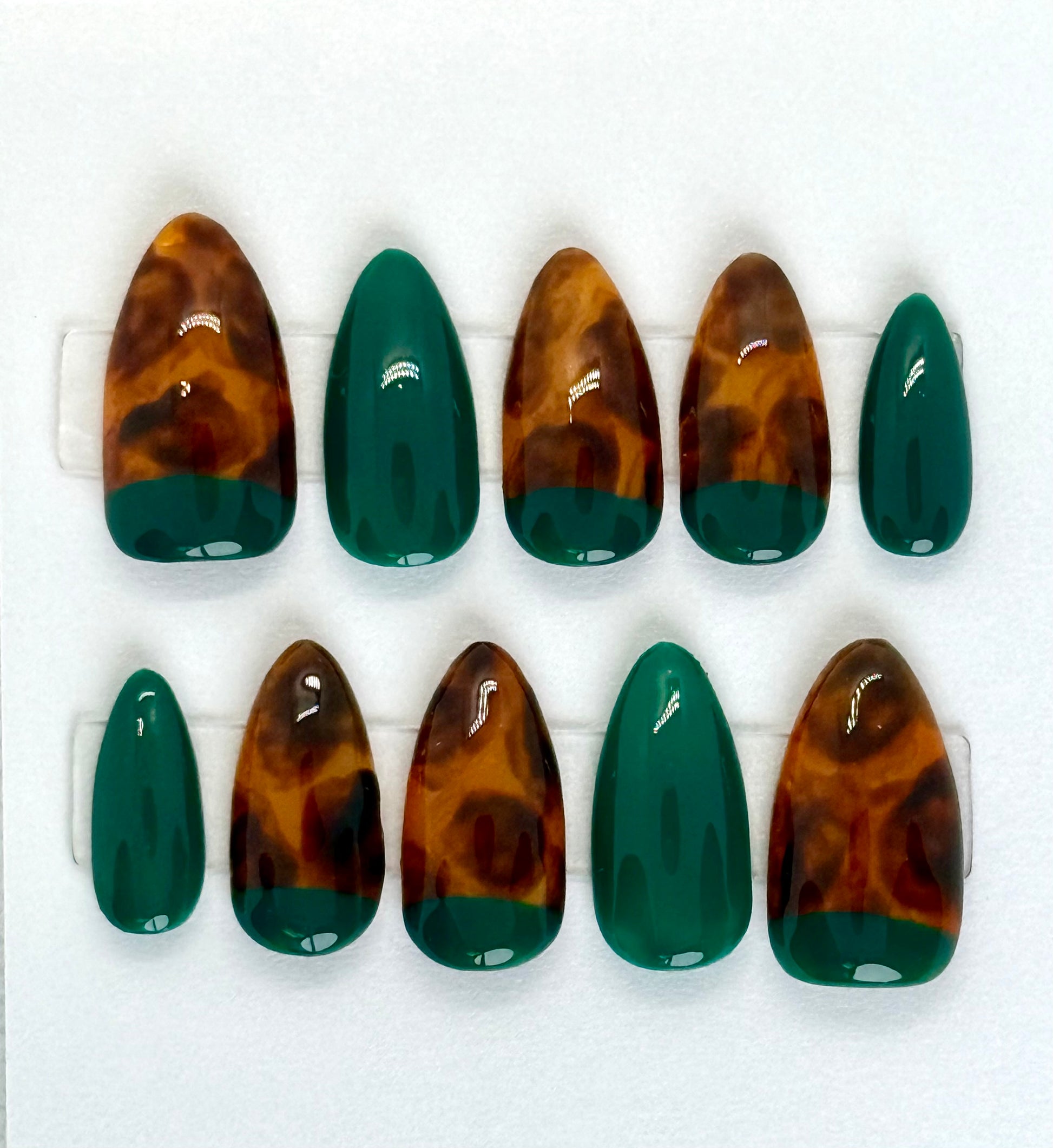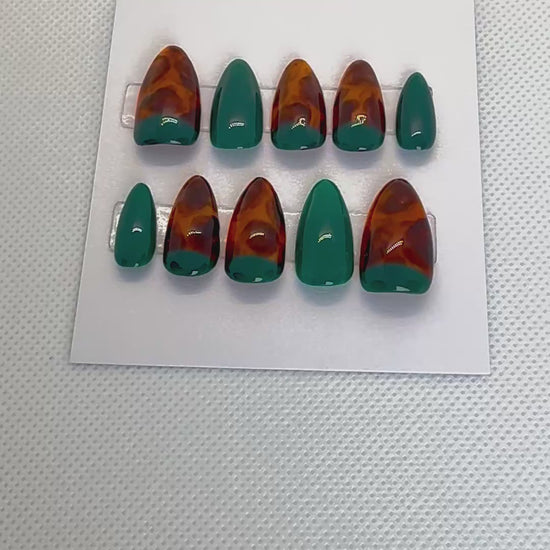 Perfect for fall and winter, this set brings together the timeless look of tortoiseshell with the vibrance of evergreen—making it a versatile choice for both everyday wear and special occasions. Custom-fitted, reusable, and designed to turn your nails into a statement piece.