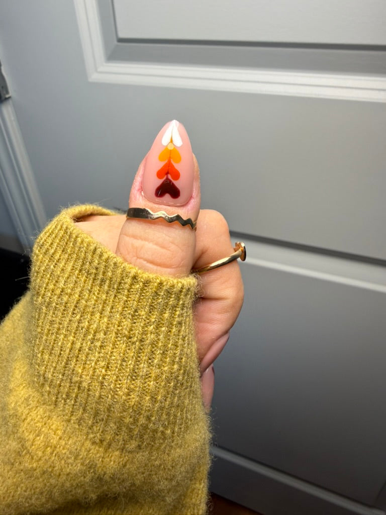 Celebrate cozy season with Autumn Love. This playful set features hand-painted heart vines in rich autumn shades on a warm nude base. Each design feels like a love letter to fall, blending whimsy with modern minimalism. Whether you’re sipping cider or heading out for a fall festival, these nails bring the perfect pop of color to your look.
