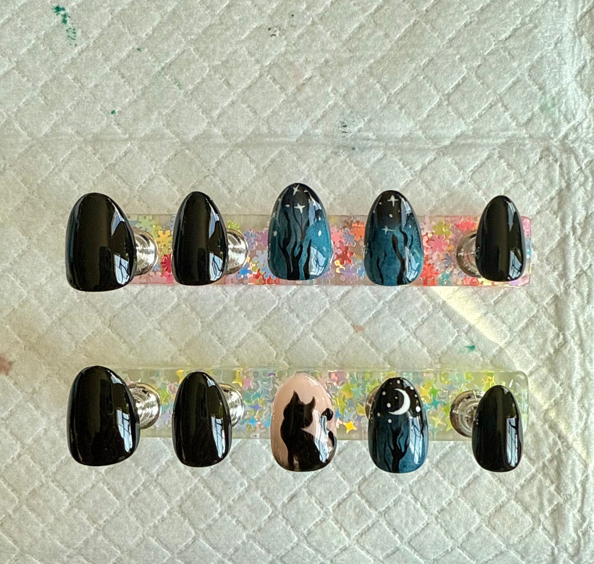 Embrace the mystery of the night with this enchanting set. Midnight Familiar features a hand-painted black cat perched under a crescent moon, surrounded by starry skies and shadowy trees. Deep, glossy blacks and moody midnight blues create the perfect backdrop for this magical design.