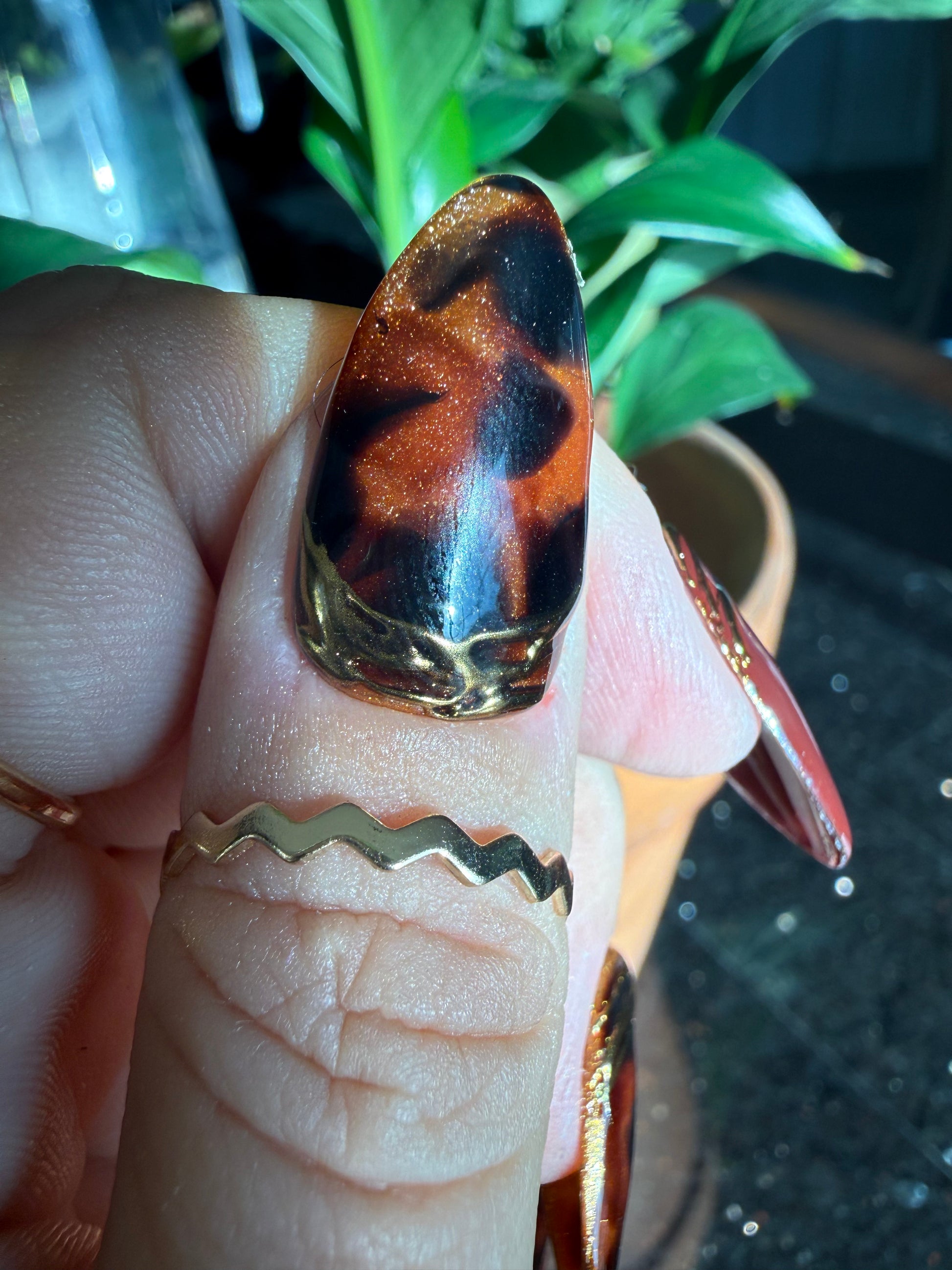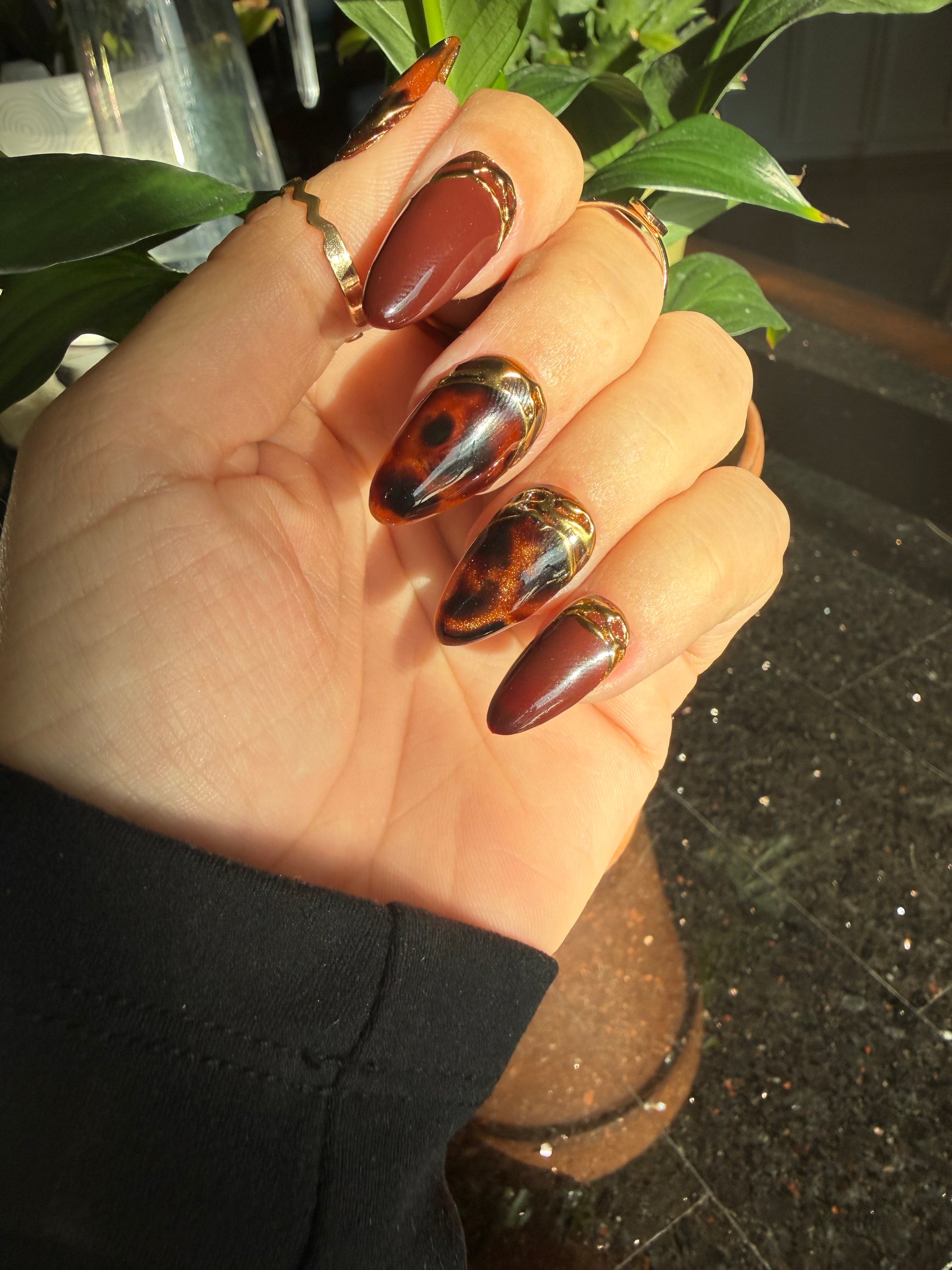 Rich, warm, and full of depth—Tortoise Treasure is the definition of quiet luxury. This set combines deep mahogany tones with glossy tortoiseshell patterns, framed by fine gold detailing that catches the light beautifully. The mix of texture and shine gives each nail a jewelry-like finish, timeless and refined. It’s earthy yet elevated, perfect for fall outfits, cozy dinners, or anyone who loves a touch of understated glamour.